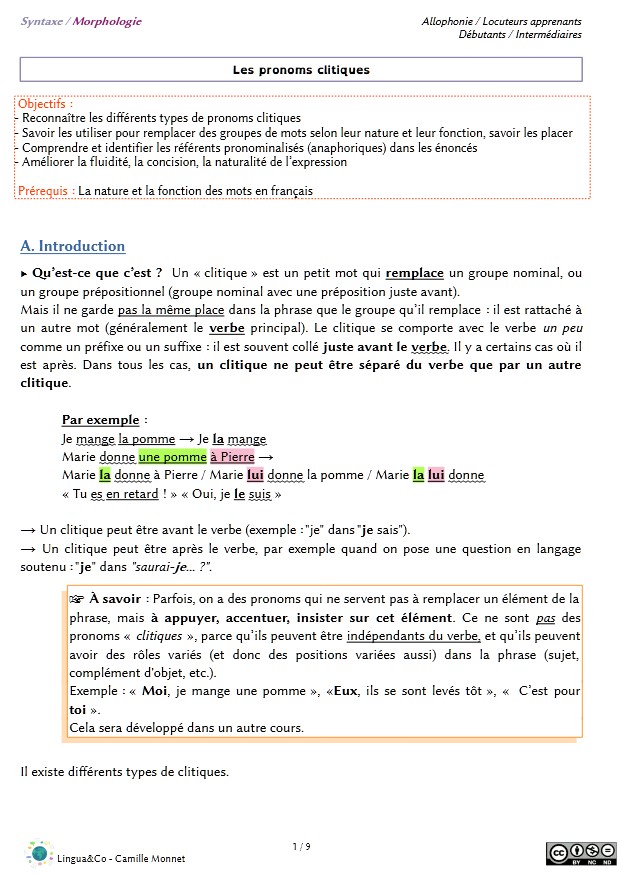 Cette fiche axée sur la syntaxe (avec un axe secondaire sur la morphologie) reprend le concept de pronoms clitiques dans la langue française. Elle répond à différents objectifs :