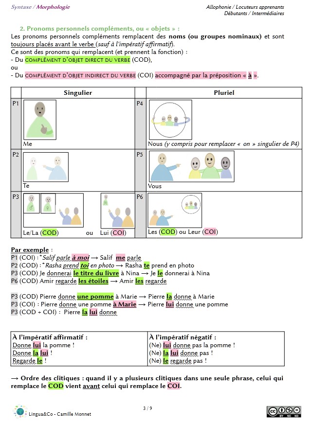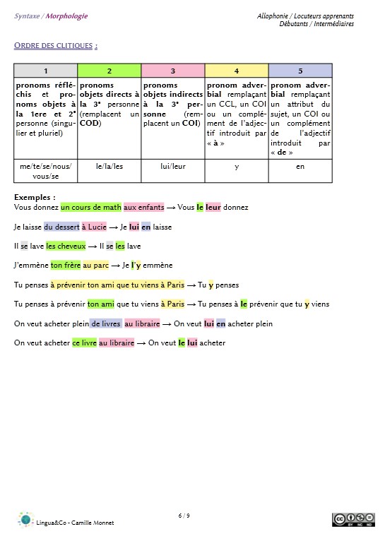 Cette fiche contient une explication théorique progressive, illustrée et en codes couleurs des différents pronoms clitiques et leur usage en contexte :
