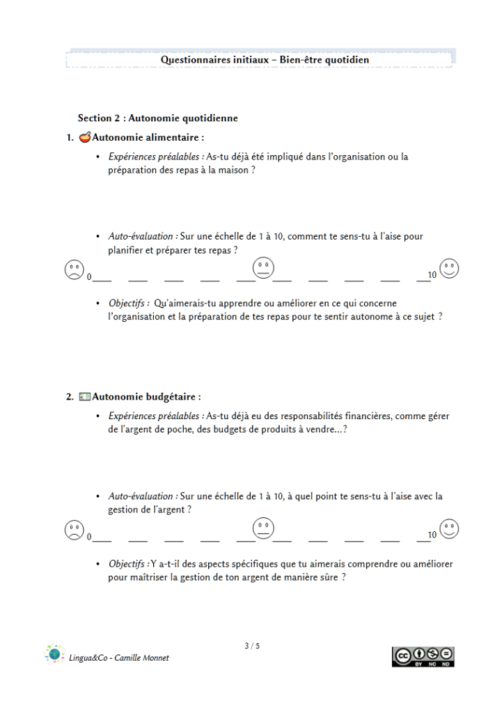 → Autres questionnaires initiaux : Bien être personnel (linguistiques, émotionnels, sociaux…) ; Consommation de produits à risque de dépendance (habitudes, contexte de consommation, proposition d’accompagnement…)